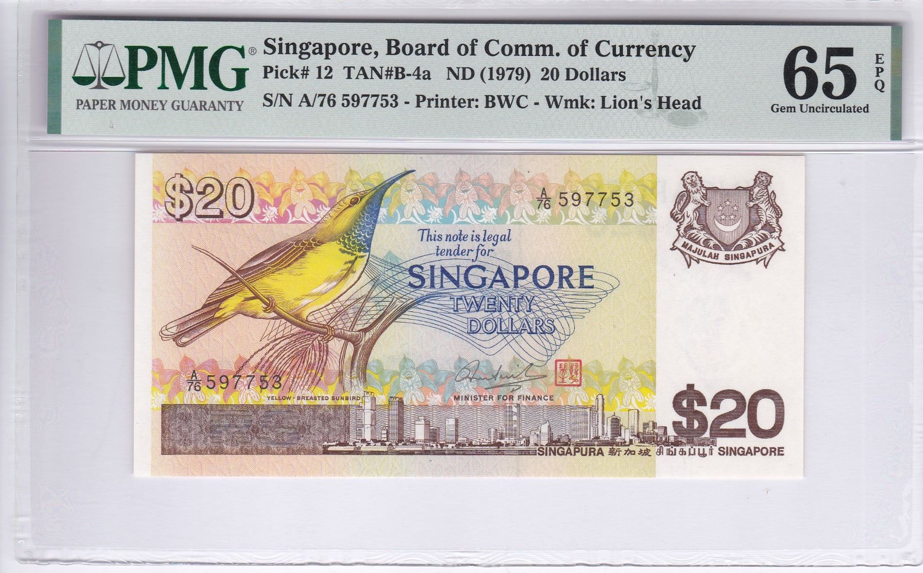 ND (1979), 新加坡, 20圓, 編號: A/76 597753. PMG 65EPQ.