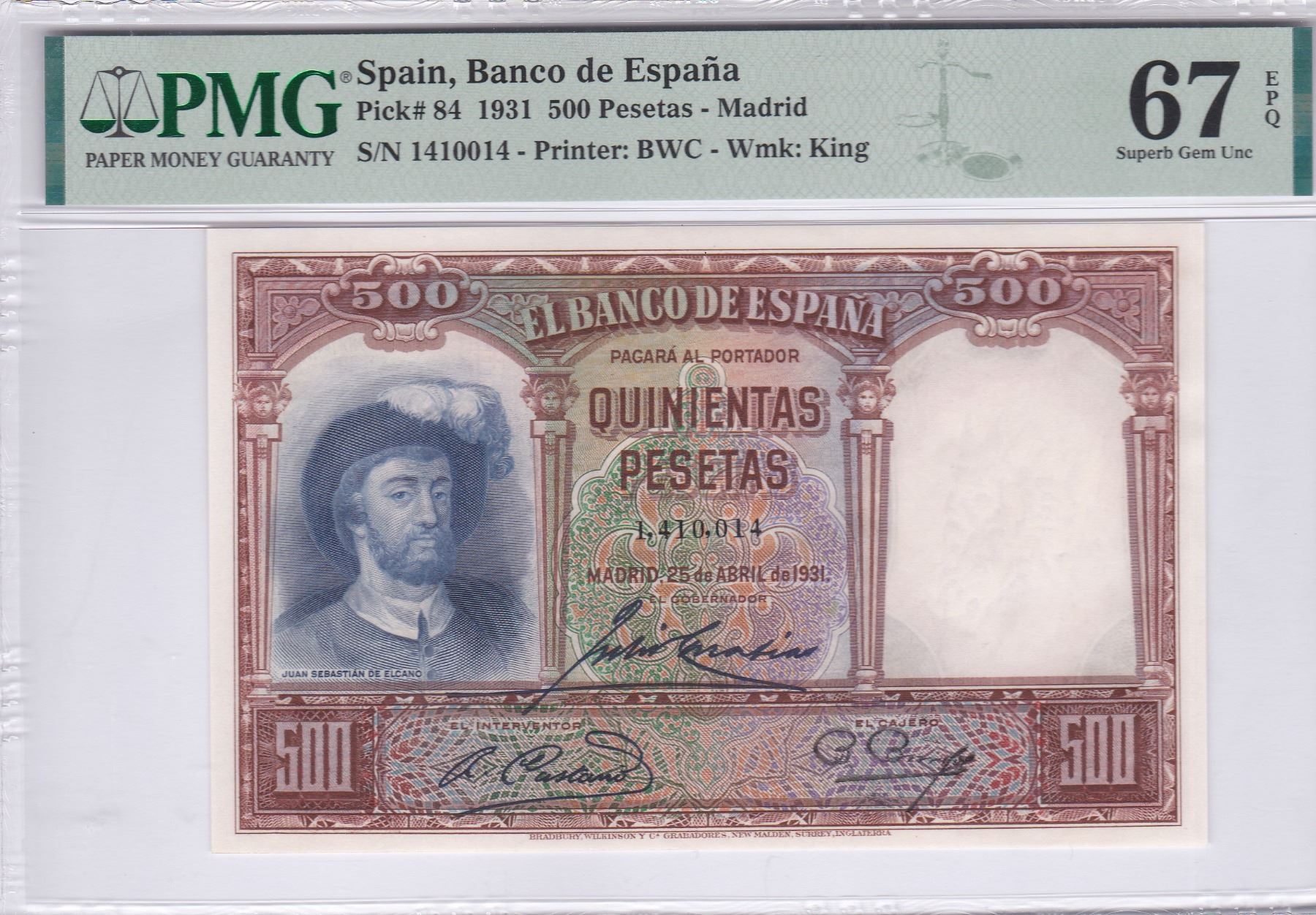 1931, 西班牙, 500 Pesetas, 編號: 1410014. PMG 67EPQ.