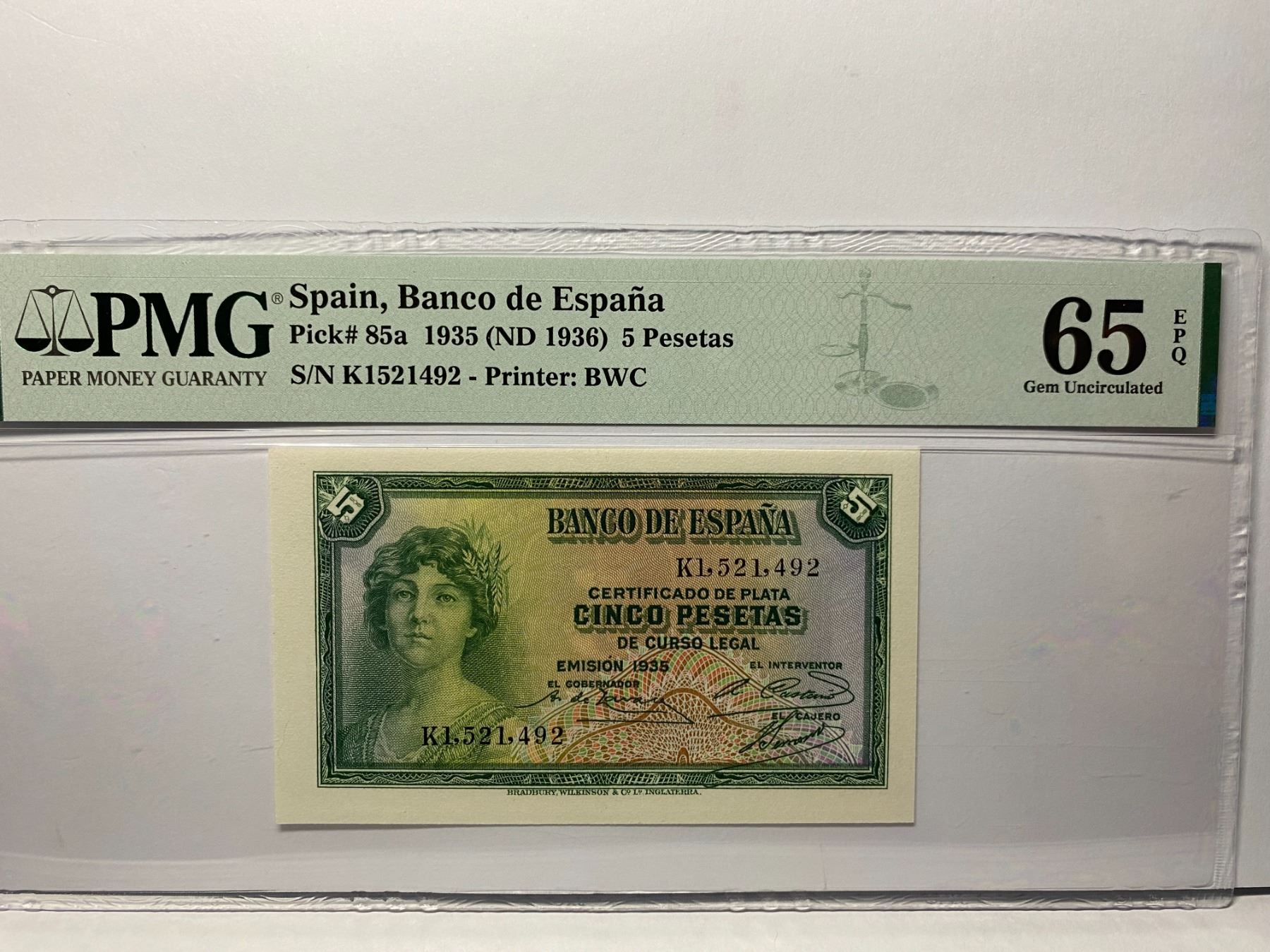 K1521492, ND 1936 西班牙, 5 Pesetas, PMG 65EPQ, K1521492, ND 1936 Spain, 5 Pesetas, PMG 65EPQ