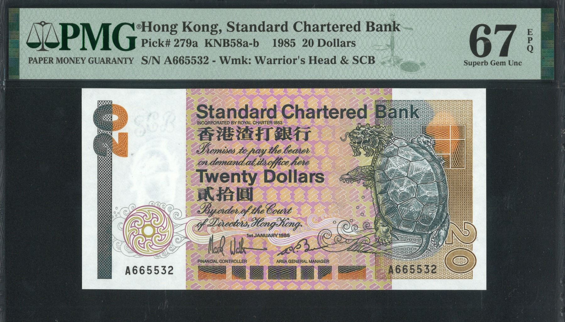 1985, 渣打銀行, $20, 編號: A665532. PMG 67EPQ. A 冠