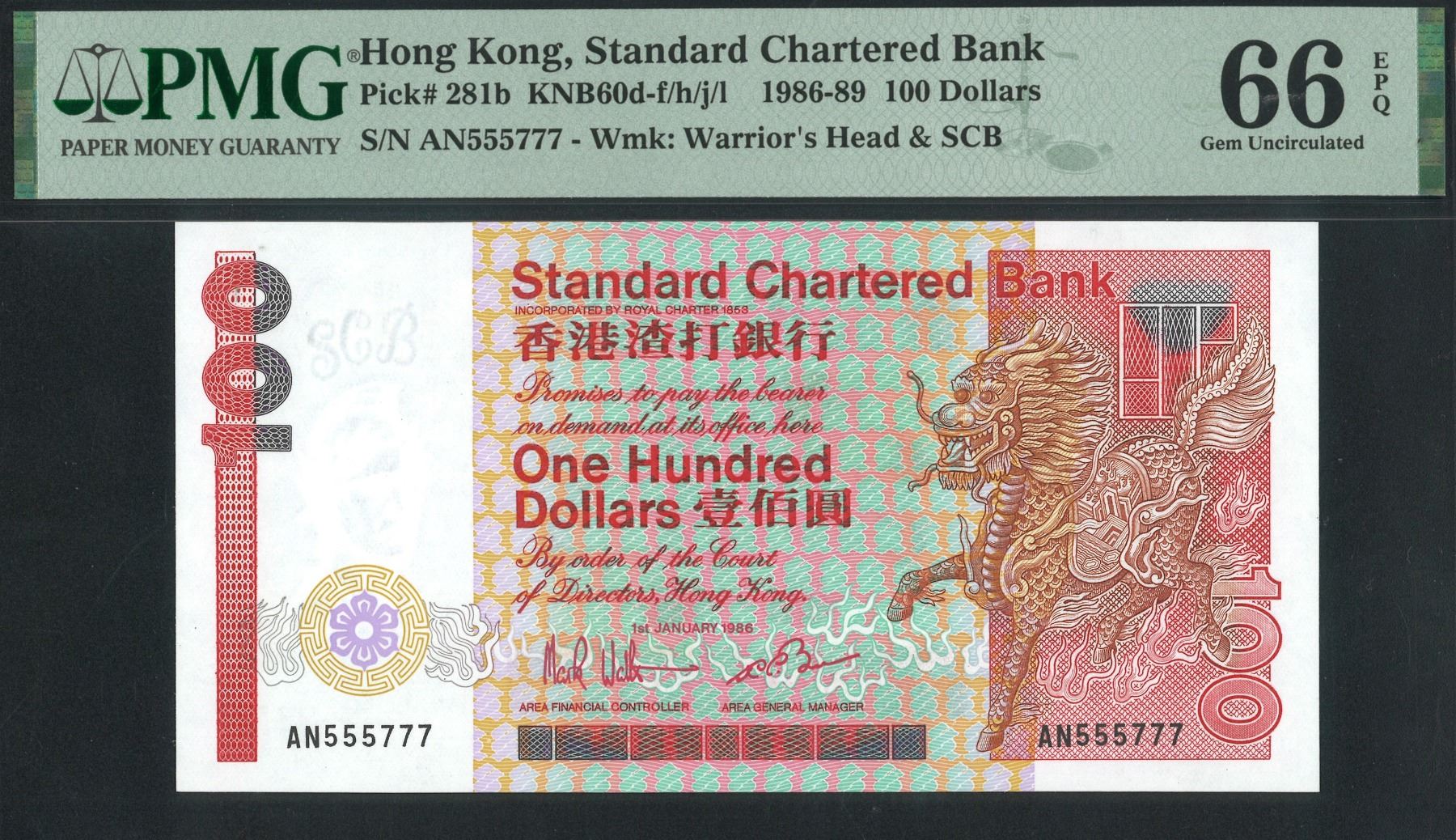 1986, 渣打銀行, $100, 編號: AN555777. PMG 66EPQ. 少有86年長棍雙豹號