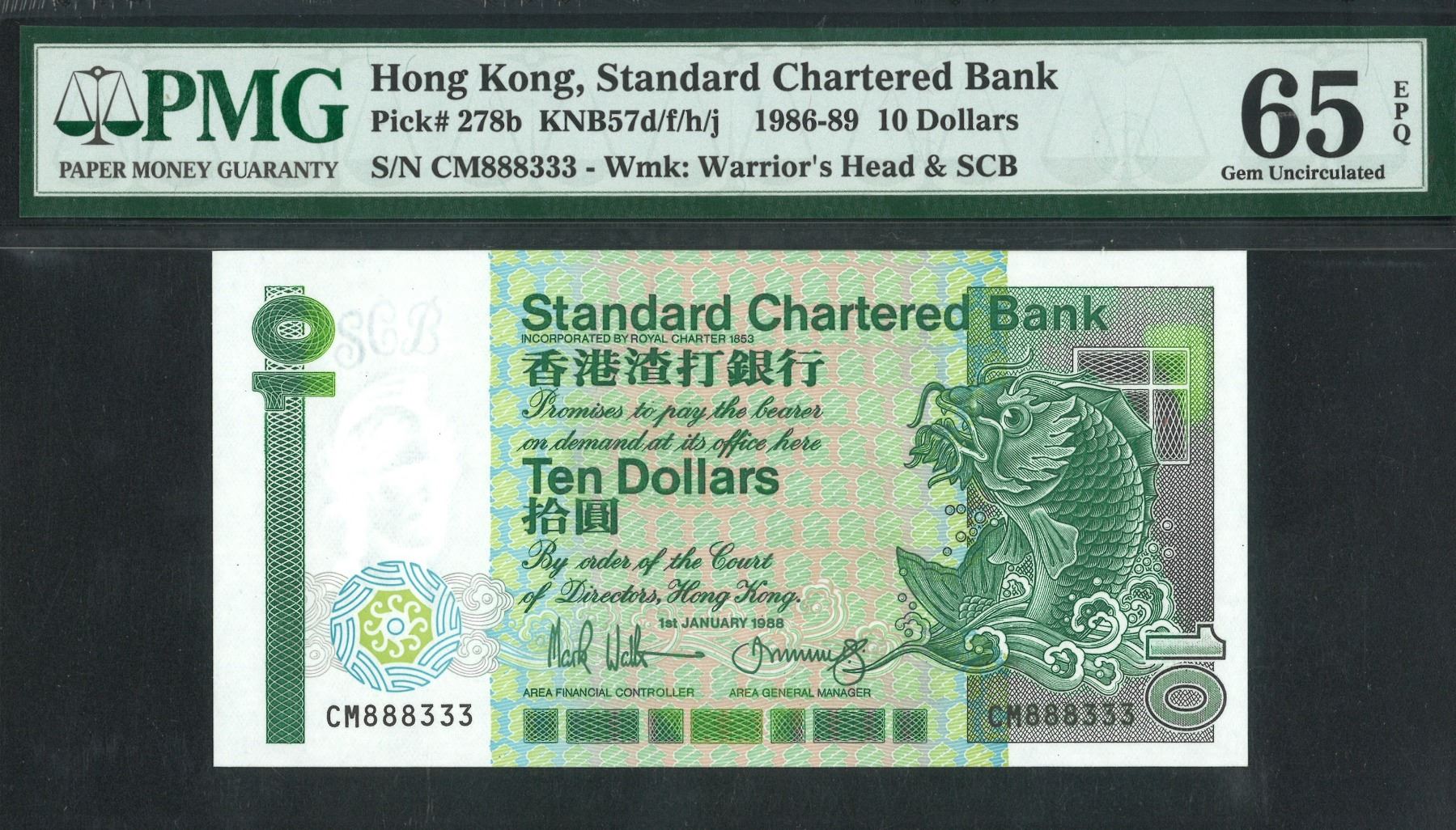 1988, 渣打銀行, $10, 編號: CM888333. PMG 65EPQ. 雙豹號