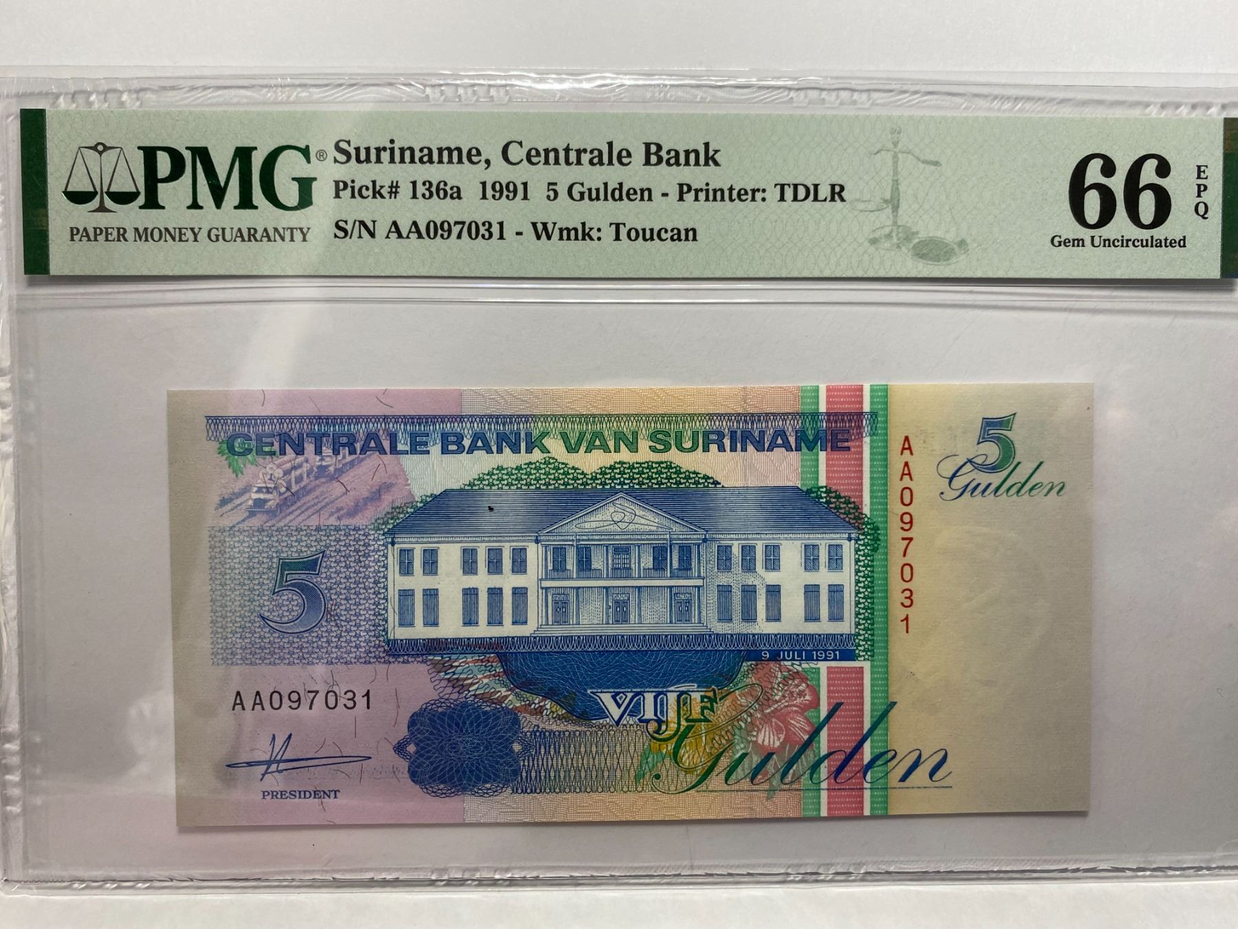 AA097031, 1991 蘇里南中央銀行, 5 Gulden, PMG 66EPQ, AA097031, 1991 Suriname Centrale Bank, 5 Gulden, PMG 66EPQ