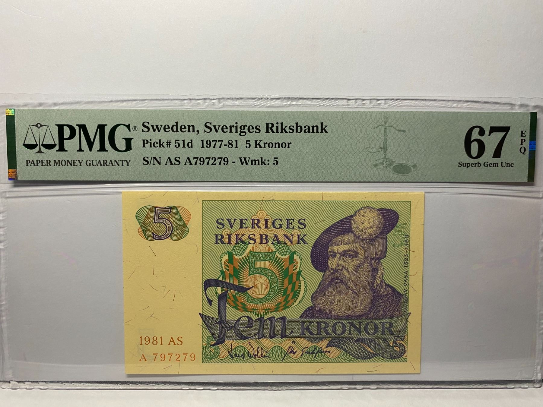 AS A797279, 1977-81 瑞典, 5 克朗, PMG 67EPQ, AS A797279, 1977-81 Sweden, Sveriges Riksbank, 5 Kronor, PMG 67EPQ