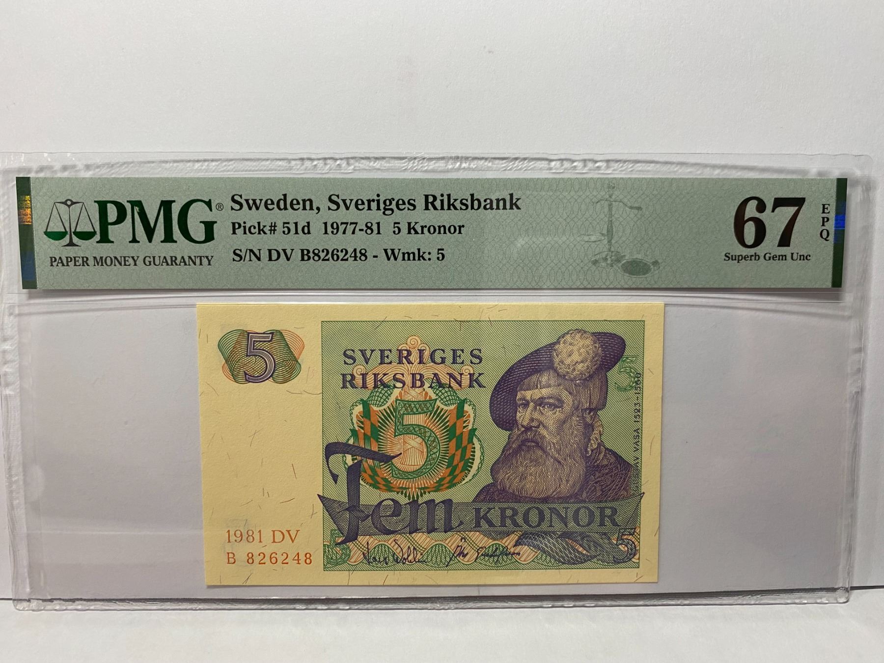 DV B826248, 1977-81 瑞典, 5 克朗, PMG 67EPQ, DV B826248, 1977-81 Sweden, 5 Kronor, PMG 67EPQ