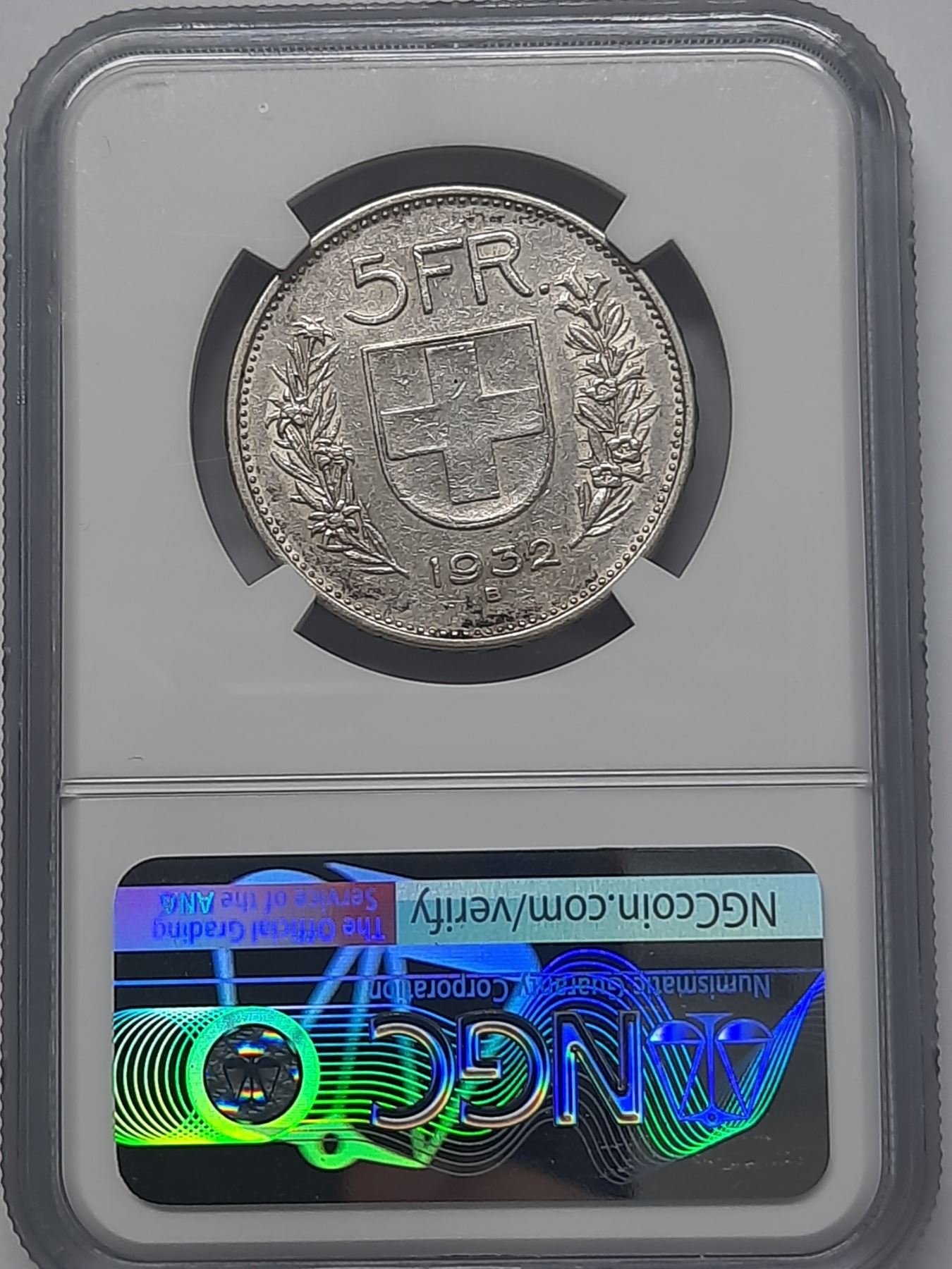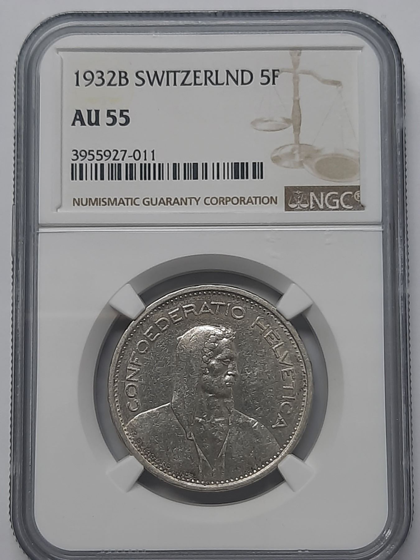 瑞士, 5 法朗 銀幣, 1932-B, NGC AU55, Switzerland, 5 Francs silver coin, 1932-B, NGC AU55