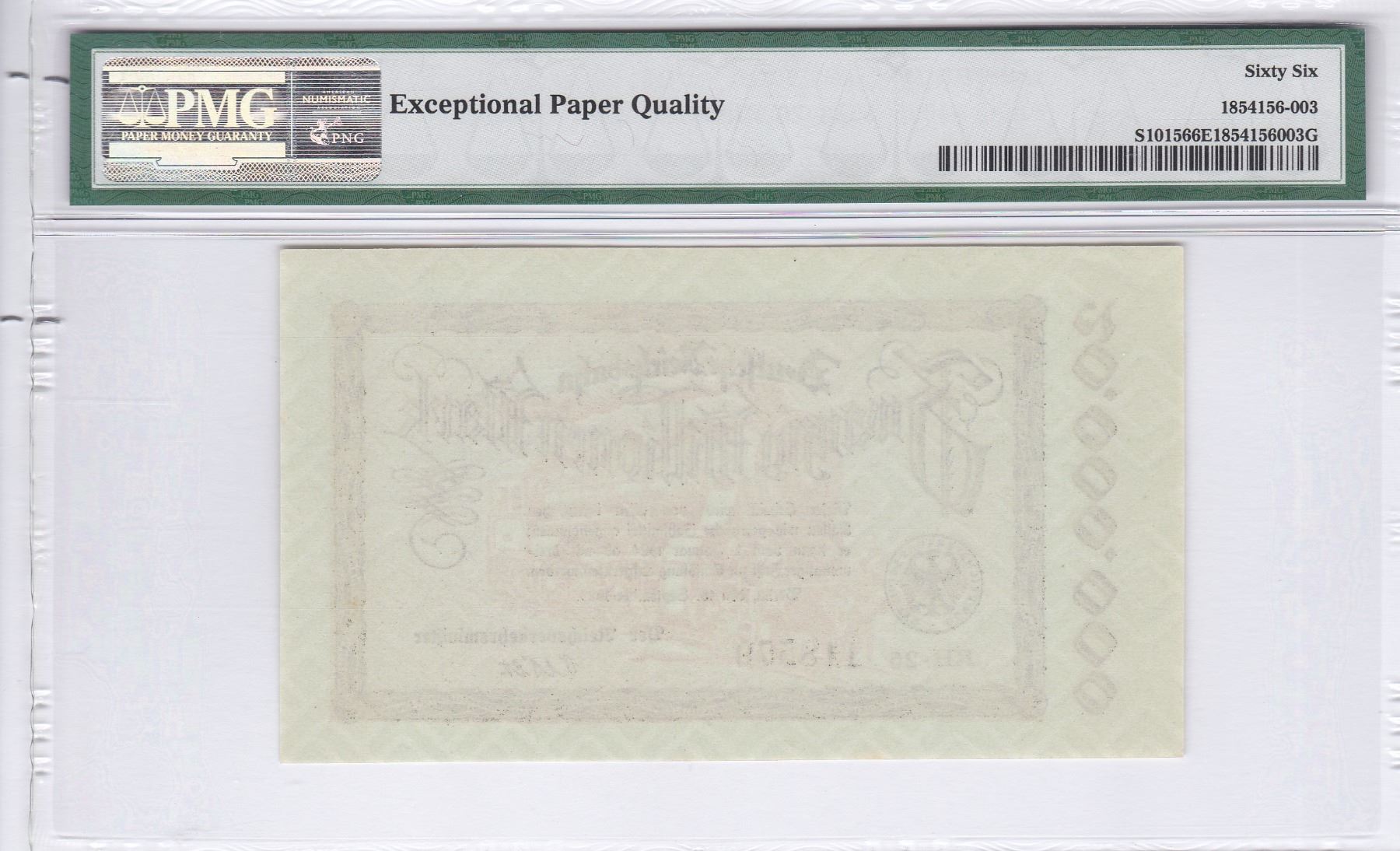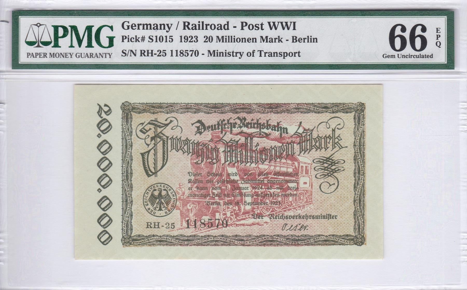 [冠軍分] 1923, 德國鐵路票, 二千萬馬克, 編號: RH-25 118570. PMG 66EPQ. 罕有, 此為全PMG紀錄唯一冠軍分