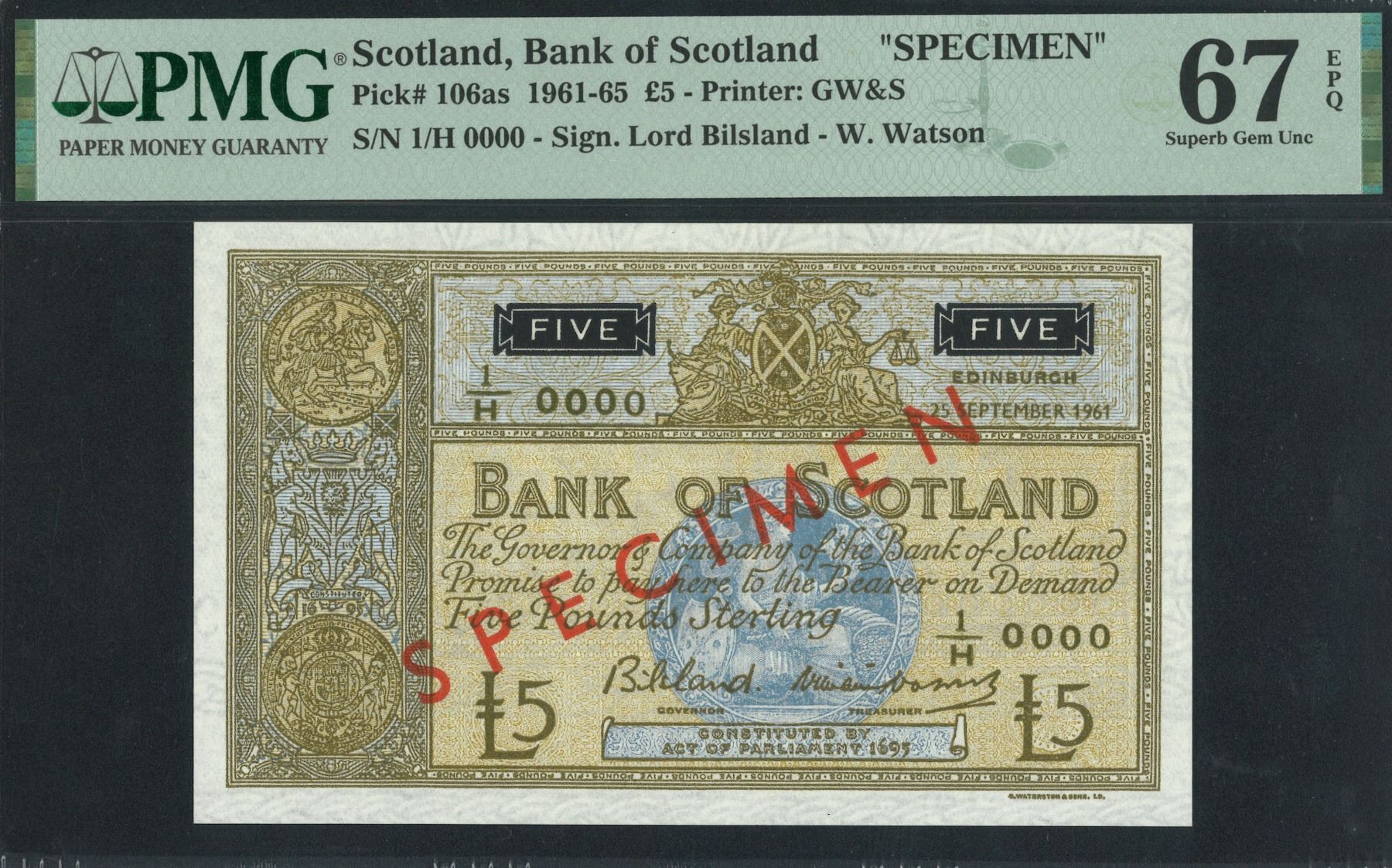 [Top Pop] Scotland, 1961, 5 Pounds, 1/H 0000. PMG 67EPQ. Specimen. Only 2 pcs 67EPQ in PMG Record.
