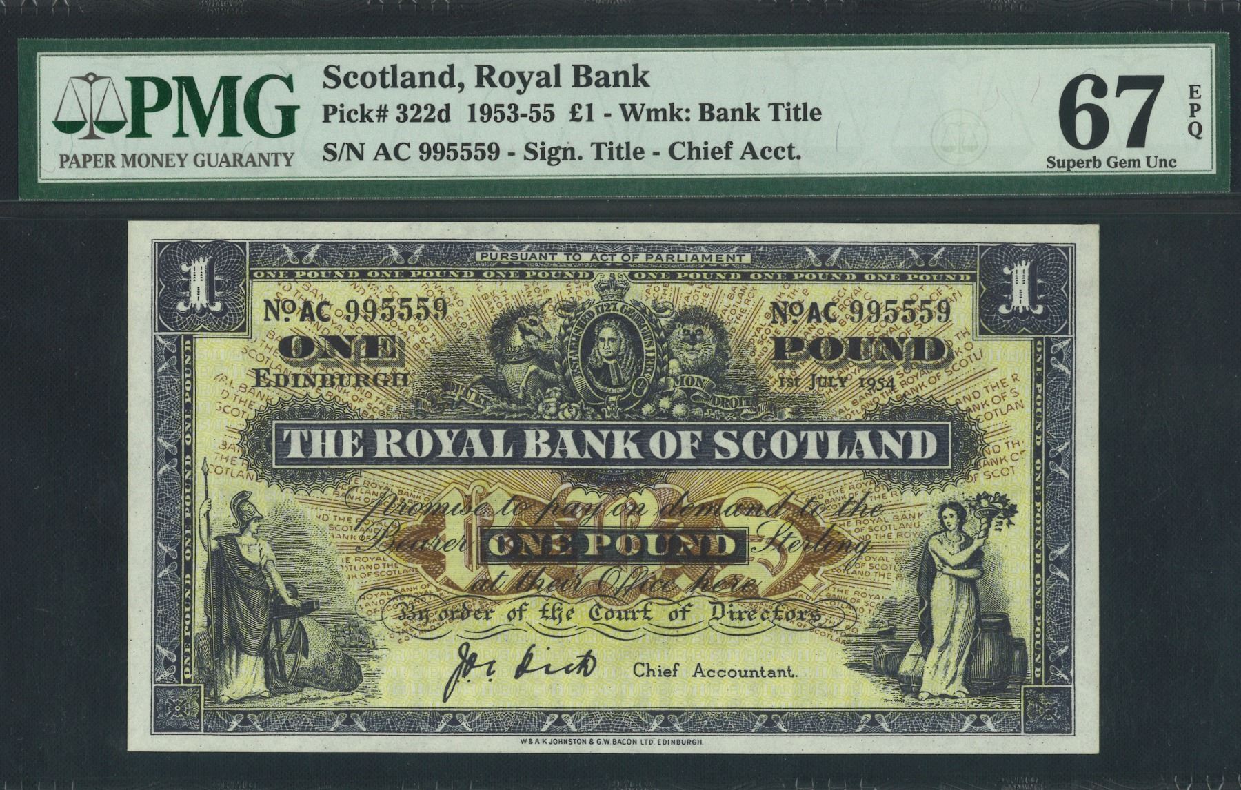 [冠軍分] 1954, 蘇格蘭皇室銀行, 1 鎊, 編號: AC995559. PMG 67EPQ. PMG 紀錄中只有這張最高評級, 二字鈔趣味號更是錦上添花!