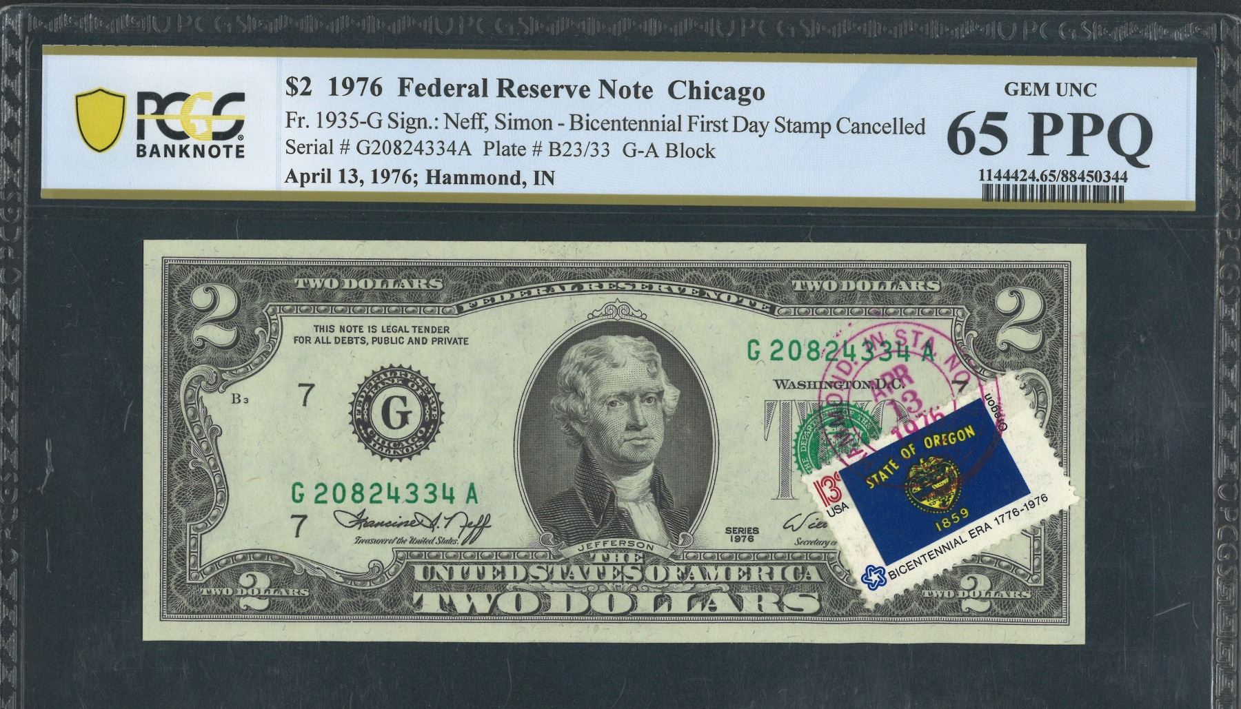 1976, 美金, $2, G20824334A, 貼1976 年首發奧勒岡州二百週年紀念郵票連郵戳, PCGS 65PPQ.