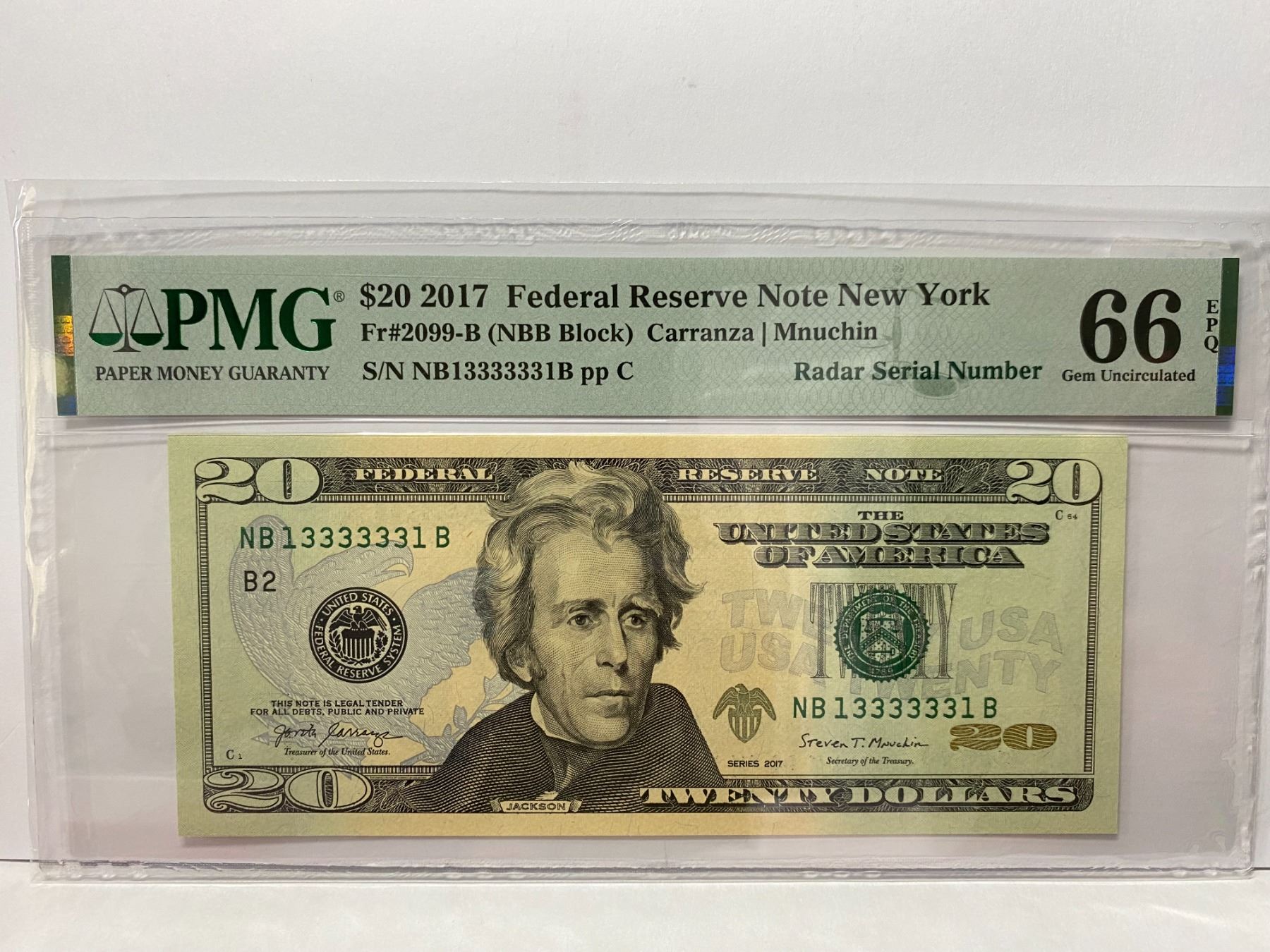 NB13333331B, (NBB Block) 雷達號, 2017 美金, 20 圓, PMG 66EPQ, NB13333331B, (NBB Block) Radar Serial Number, 2017 Federal Reserve Note New York, 20 dollars, PMG 66EPQ