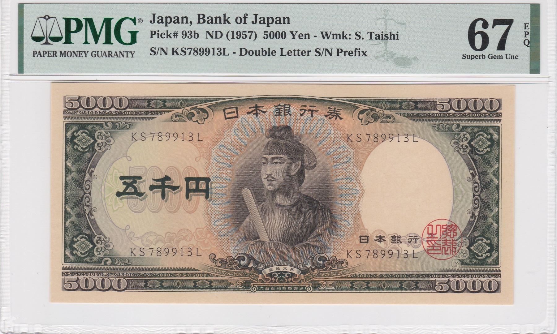 Withdraw ND 1957, Japan, 5000 Yen, PMG 67EPQ Superb Gem Uncirculated.