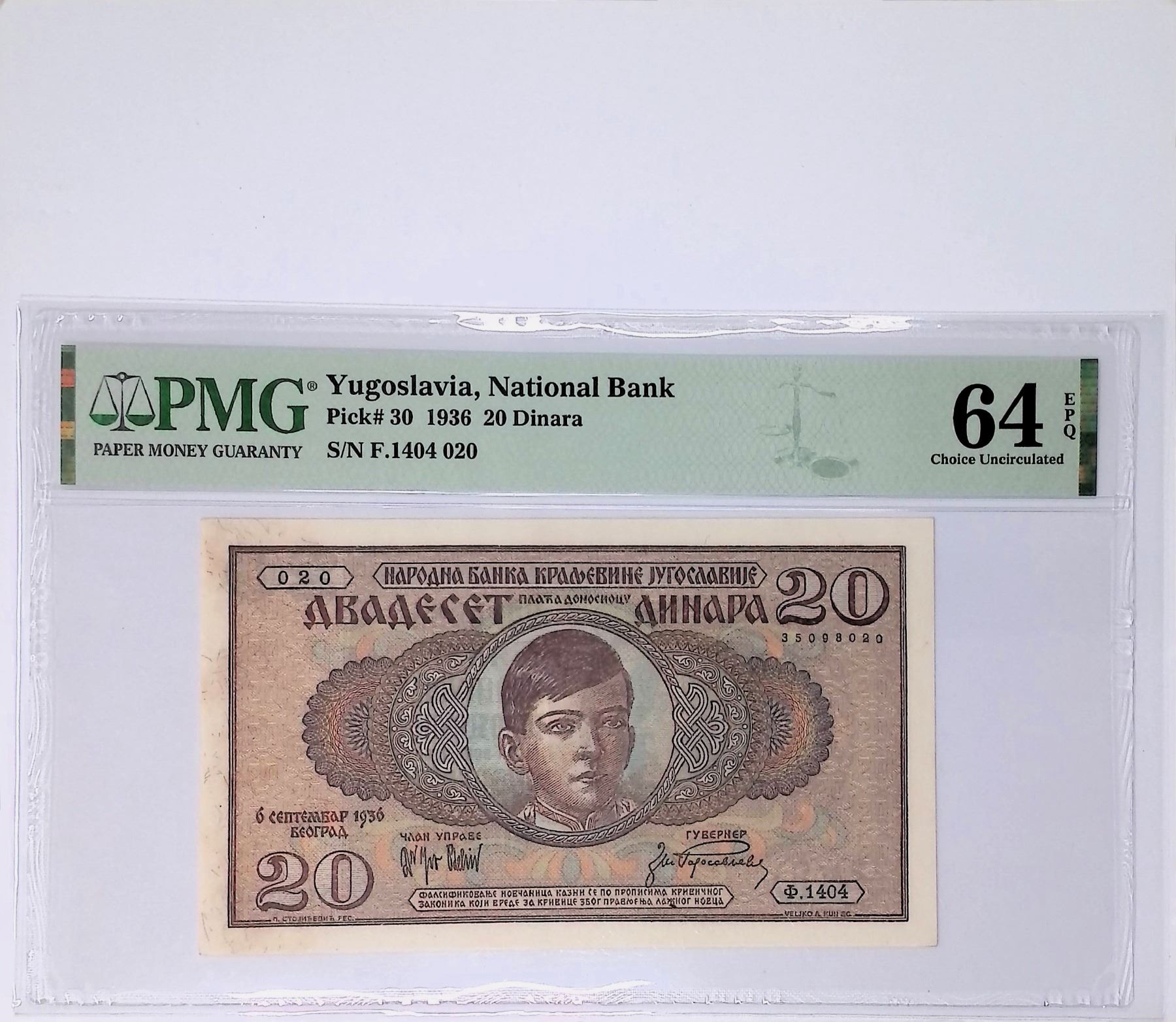 Yugoslavia 1936, 20 Dinara F1404020 PMG 64EPQ