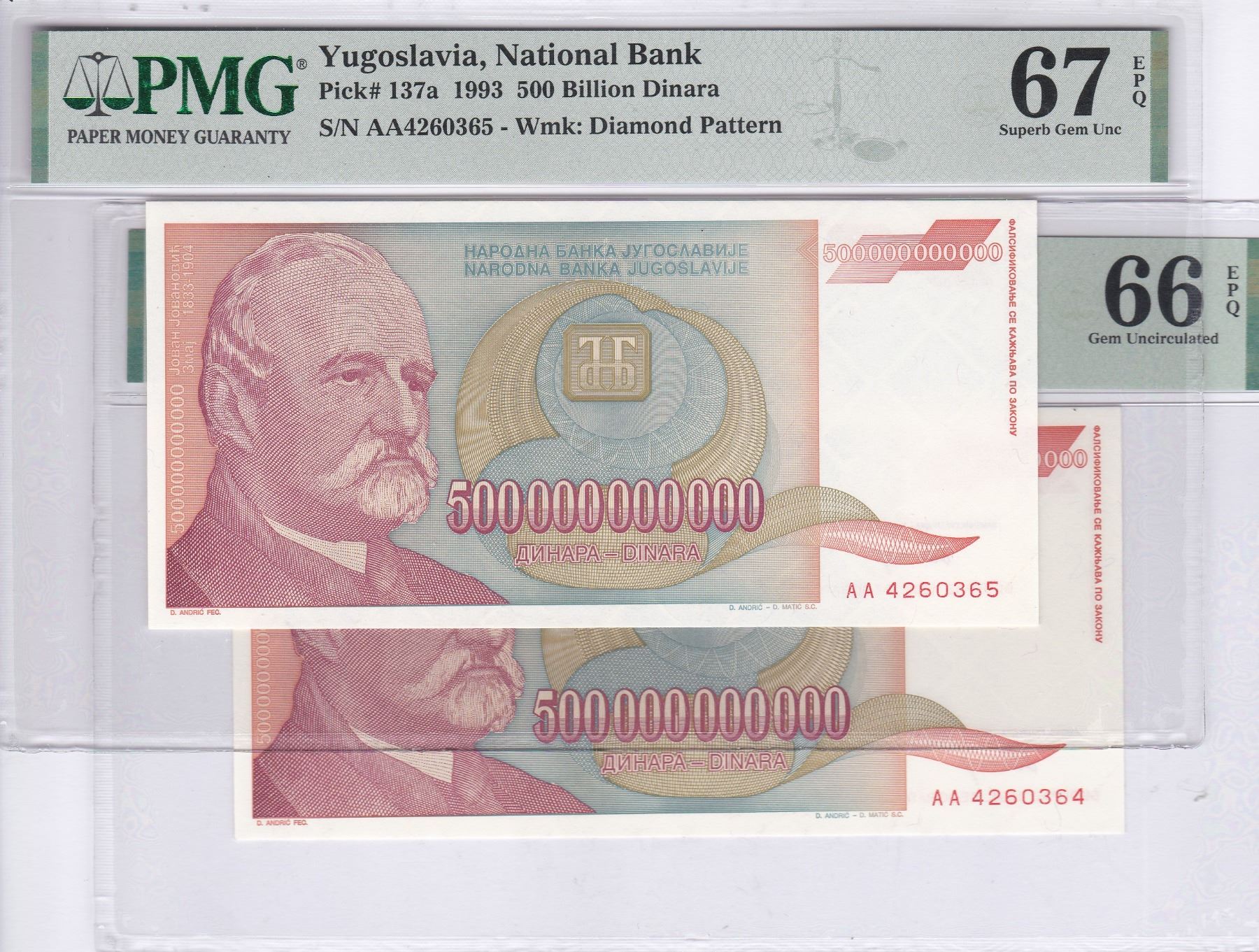 Yugoslavia, 1993, 500 Billion Dinara, Lot of 2, AA4260364 -65, PMG 66 -67EPQ.